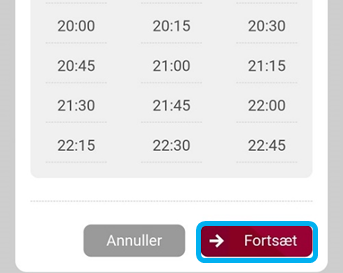 - Scroll ned på siden, vælg første ledige klokkeslæt og klik på "Fortsæt".