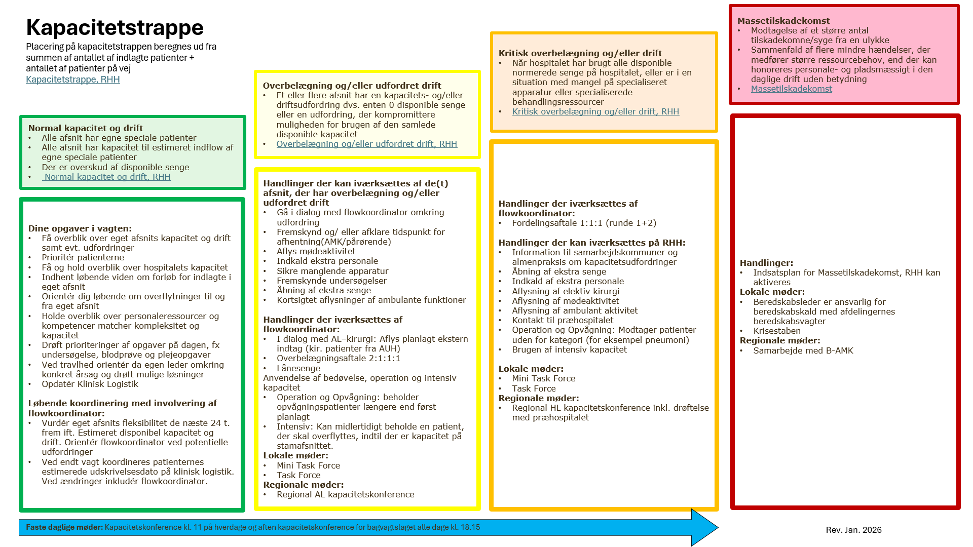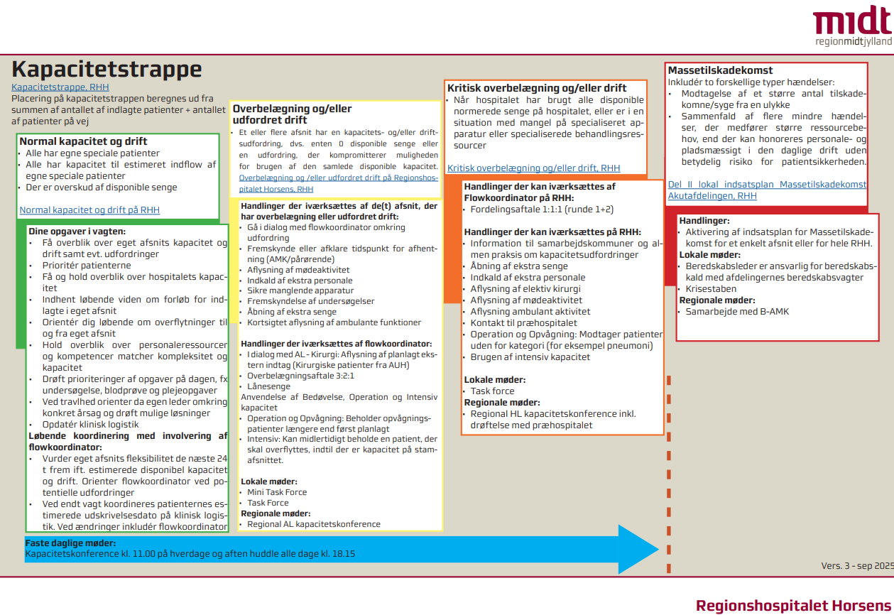 Når hospitalet har brugt alle disponible normerede senge på hospitalet, eller er i en situation med mangel på specialiseret apparatur eller specialiserede behandlingsressourcer.