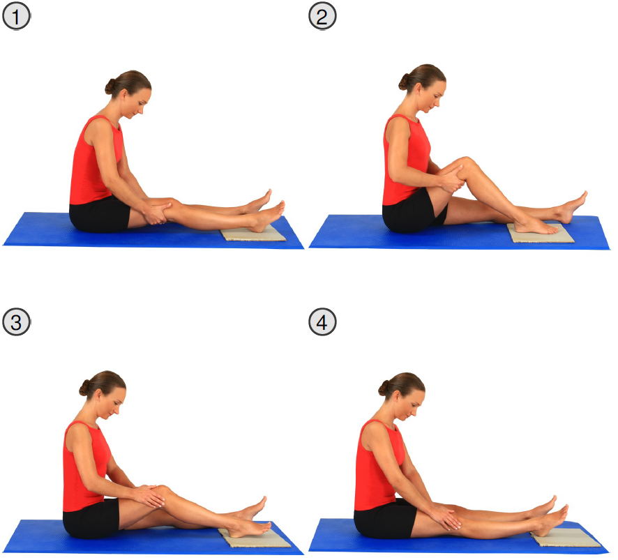 Udgangsposition: Langsiddende med hænderne fat om låret. Placér en tæppeflise under foden for at lette bevægelsen.