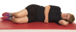 Lig på siden med bøjede ben og træningsbenet øverst, ryggen holdes i neutral stilling